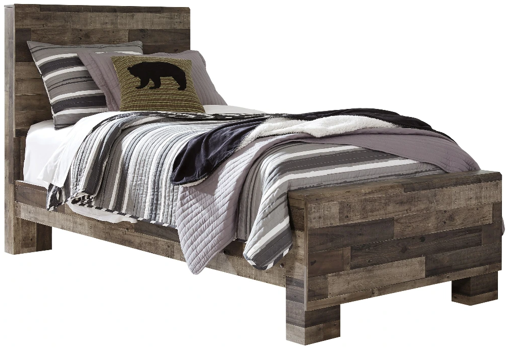 Modern yet hefty. This twin panel bed makes an urban eclectic statement. Seasoned raw wood look merges with the clean lined design we love today. Muted rustic finish over replicated pine grain maintains its authenticity for a beauteous look.Read More