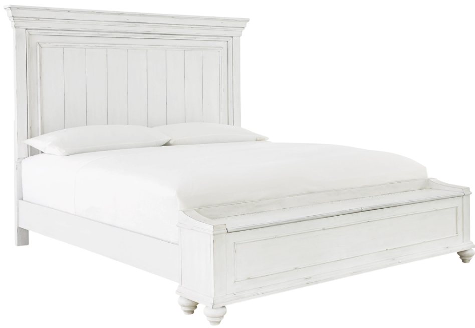 Give your retreat vintage charm with this Queen panel bed with storage bench footboard. In a beautifully distressed whitewash finish, you'll love the headboard's grand style featuring a picture framed panel. The bench footboard is equally elegant offering extra storage and a convenient seat.Read More