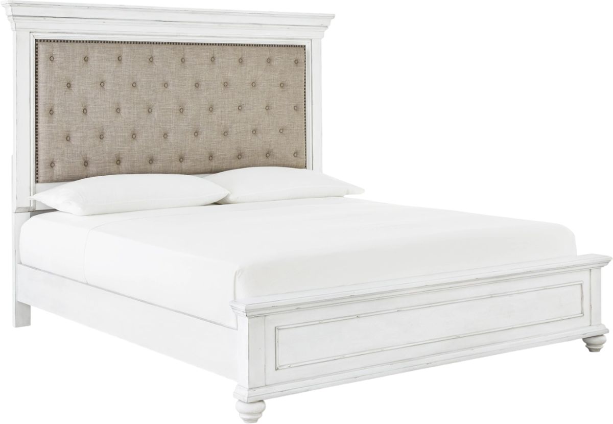 Give your retreat vintage charm with this bed. In a beautifully distressed whitewash finish, you'll love the headboard's grand style featuring an inset button tufted upholstery cushion. Generously scaled moulding from top to bottom, along with bun feet and nailhead trim give this bed character—evoking the feel of a quaint cottage escape.Read More