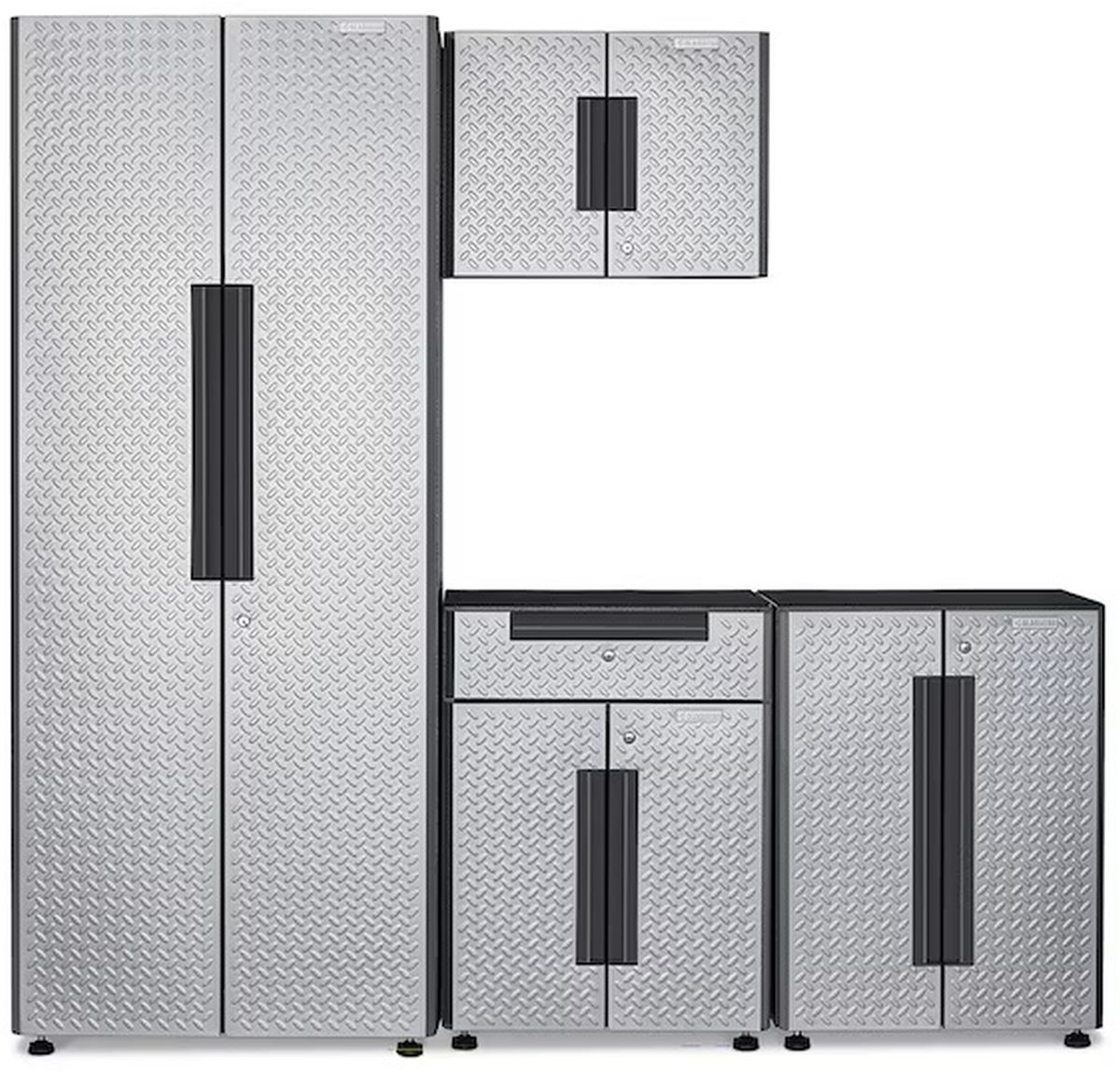 The Gladiator® Flex Cabinet System V is your all-in-one storage solution. These garage storage cabinets include one 30" tall cabinet, one 24" wall cabinet, one 24" 2-door base cabinet and one 24" 1-drawer, 2-door base cabinet.Read More
