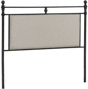 A fusion of metal and upholstered bed styles. The Hillsdale Furniture Ashely Bed is simultaneously rustic and contemporary. This transitional and versatile queen-size headboard features a Rustic Brown metal finish and Linen Stone upholstery to achieve a look that's complementary to any décor. The center top rail embellishment balances the turned posts with round finials and bun feet.
