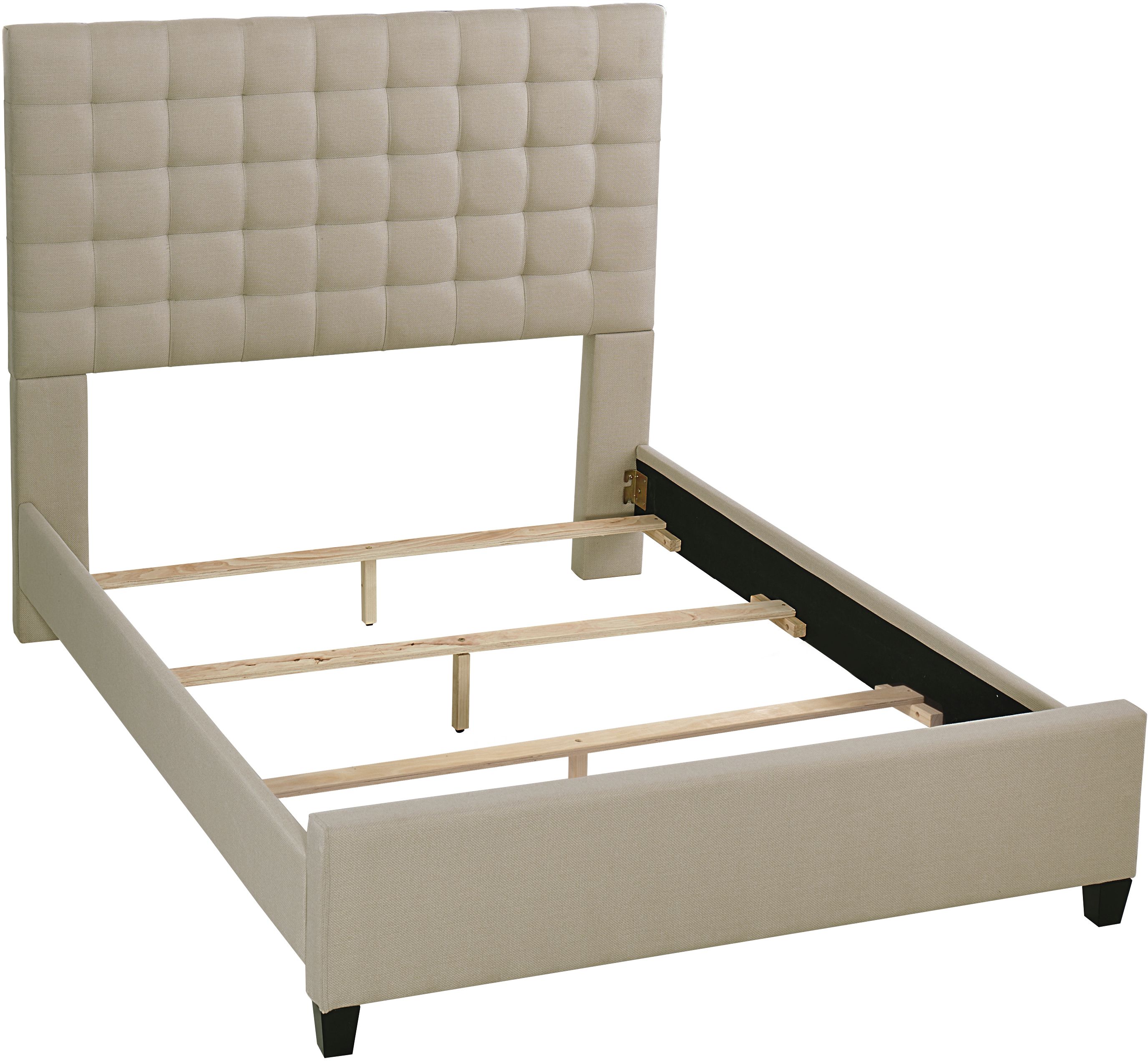 The Hillsdale Bergen King Sandstone Linen Panel Bed features a tufted fabric design on its headboard, a universal footboard, and side rail that are sold separately. This set is only the bed frame, does not come with a mattress.