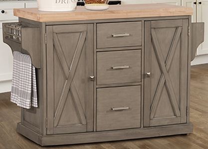 Casual style meets substantial functionality in the Hillsdale Furniture Brigham Kitchen Island. Featuring baseboard and flat panel molding with inlaid cross molding and minimalist hardware. This kitchen island table has all the charm of a country cottage. And it boasts two cabinets with adjustable shelves; three drawers with durable screw butt joints; as well as spice racks and towel rods at either end. The distressed gray finish and natural finish wood top blend with any color palette. Organize your kitchen or dining room with the Brigham Kitchen Island. Assembly required.Read More