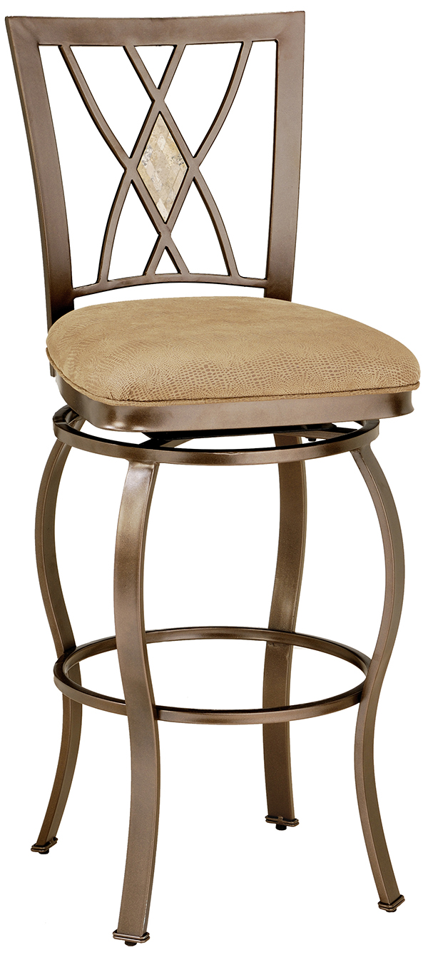 Our Brookside stools feature the lustrous depth and beauty of fossil stone and the classic effect of transitional designs. A thick patterned ivory colored fossil stone veneer graces the center of the sturdy powder coated metal backs of these stools. Stools are available in two styles, a more traditionally scrolled design which boasts an oval fossil stone motif and a more gracefully scrolled metal work, or a more transitional diamond fossil stone motif with a more angular, contemporary design. Both groups offer barstool seating in counter and bar height for your comfort, and all of the fabric on the stools have a micro suede for easy care and long lasting beauty.