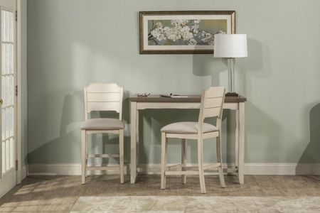 Clarion 5-Piece Counter Height Side Dining Set featuring a counter height side table with a distressed gray top and sea white base and two open back stools finished in sea white.Read More