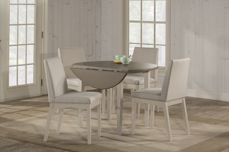 Clarion 5-Piece Round Drop Leaf Dining Set featuring a drop leaf table with a distressed gray top and sea white base and four upholstered side chairs finished in sea whiteRead More