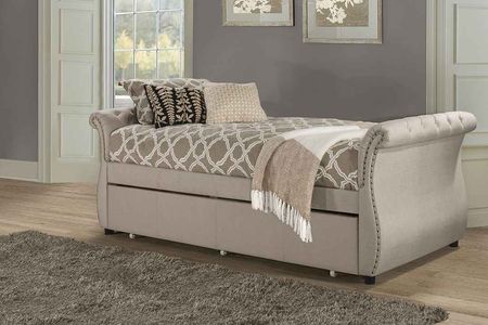 Hunter collection backless twin bed and trundle with linen sandstone upholstery. Perfect for use in bedrooms and living spaces.Read More