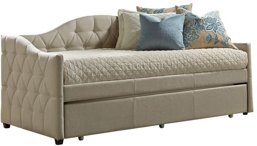 Classic bedroom design comes in a space-saving package with the Jamie Daybed and Trundle. Finished in a goes-with-everything pillowed beige fabric, the Jamie Daybed and Trundle adds extra sleep space and style all at once.