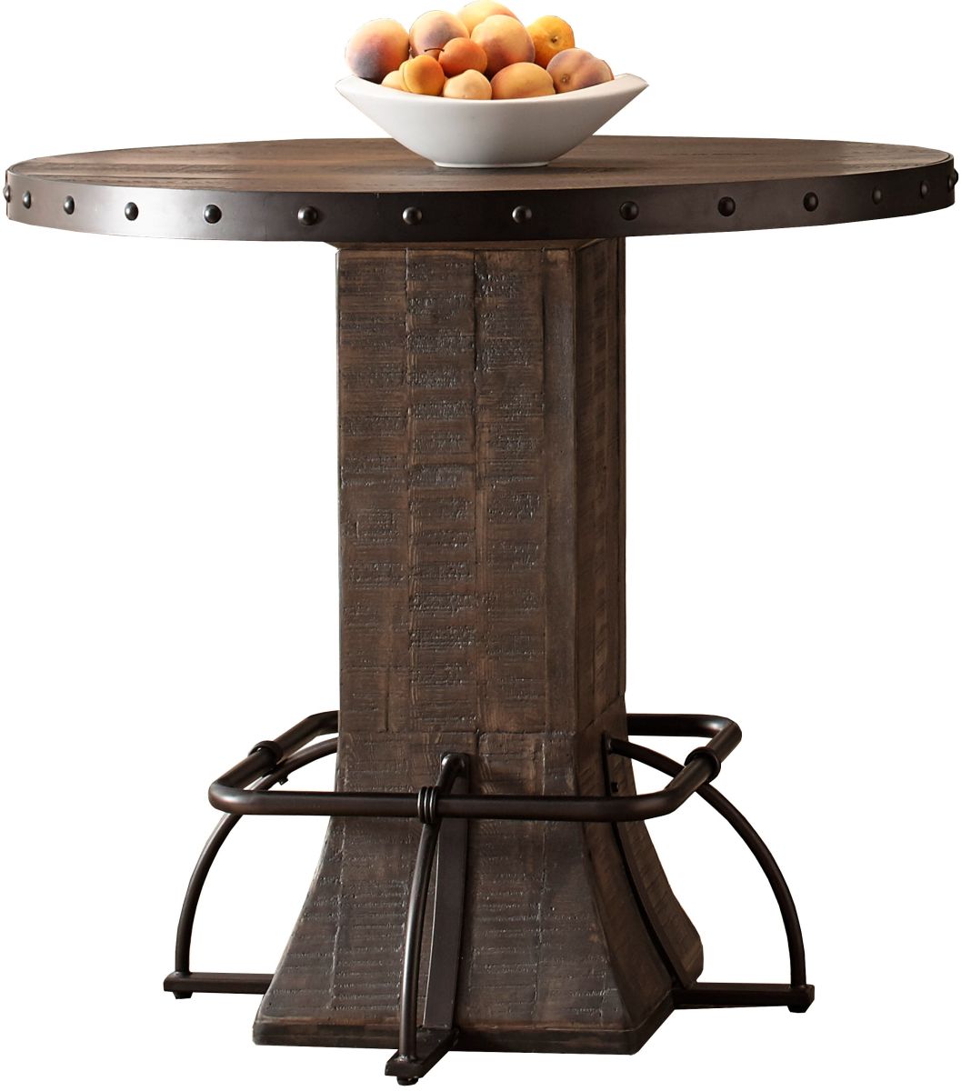 Featuring a round top built of distressed walnut and accented with brown, studded metal, the Jennings Table brings an unexpected twist to a classic and popular style.Read More