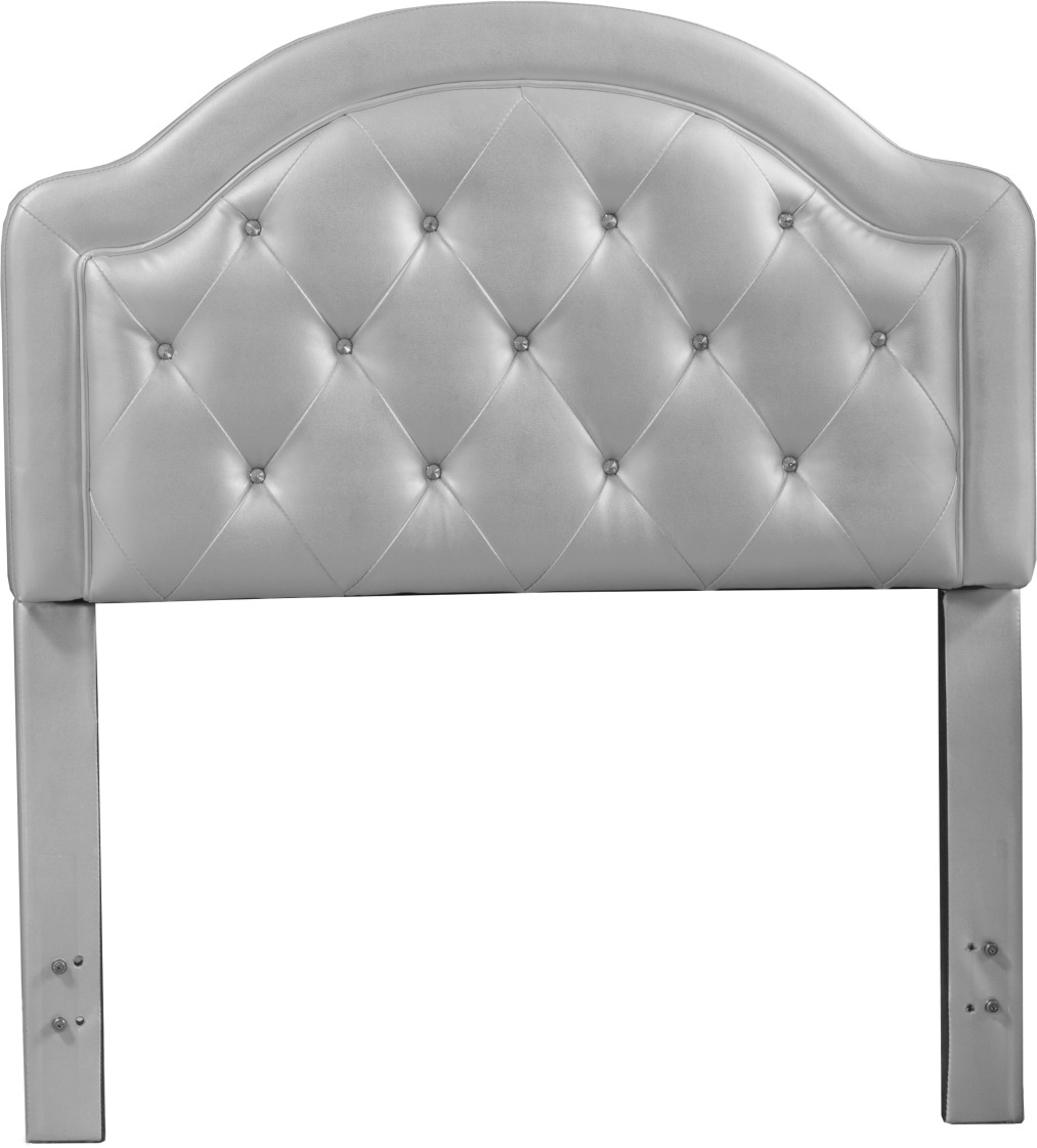 On trend metallic sheen makes an unusual match-up with the upholstered headboard trend in the unique Karley headboard. Covered in a silver embossed faux leather with glass button detailing, this headboard can be a stand-out in any room. Includes a twin size headboard only. Headboard has a 47 1/4 inch height. A metal headboard frame, a standard size twin box spring and mattress are required. Some assembly required