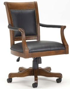 Revisit the grandeur of the classical era with the Kingston Caster Chair from Hillsdale Furniture. Gently sloping backs and ornate, carved arm rests distinguish this adjustable-height, 360-degree swivel chair; real black leather adds to the grand sophistication. In a warm medium cherry finish, the Kingston Caster Chair gives off a subtle, handsome finish. Whether in your kitchen, game room or den, the Kingston Caster Chair will make a lasting impression on your guests. Assembly required.