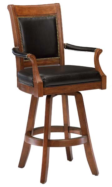 The Kingston Barstool is a distinguished addition to any home. The light cherry finished wood, black leather and felt, and nail-head trim give this grouping a stately presence. Not only is this set handsome but it is practical also, with a stool that swivels 360 degrees.
