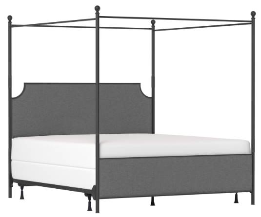 Combination of black metal and gray upholstery gives this canopy bed a soft-yet-strong aesthetic