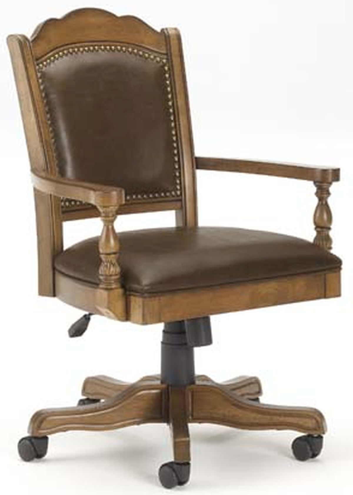 Old school meets new school in the Nassau Caster Chair from Hillsdale Furniture. Bi-cast brown leather and brown finish with nail head trim bestow an antique aesthetic to this striking chair. Featuring sturdy casters and 360-degree swivel, the height-adjustable Nassau Caster Chair provides comfort for your friends, family and guests. Gather around your table in these nostalgic chairs for some good old fashioned fun. Assembly required.Read More