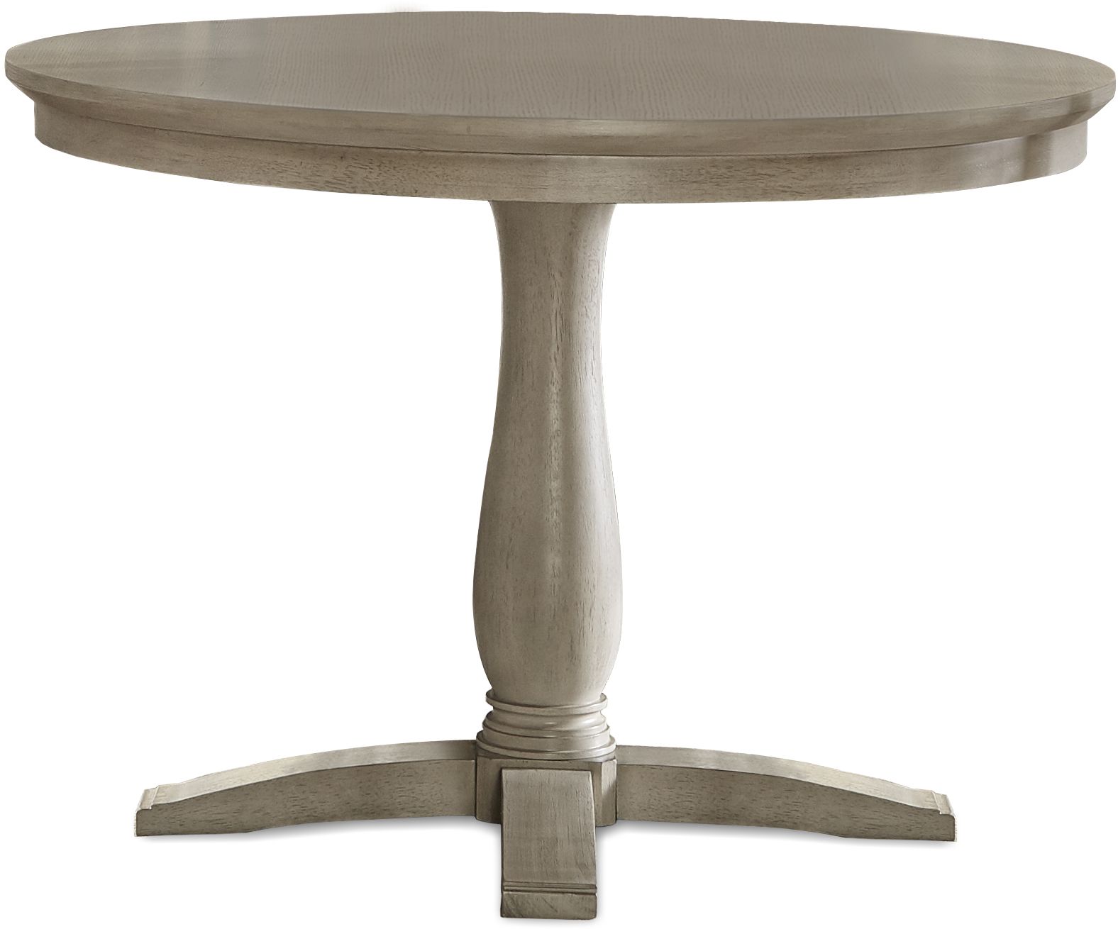 Breezy and graceful. The Hillsdale Furniture Ocala Round Pedestal Dining Table features a warm Sandy Gray finish. Its shapely pedestal base comprises a curvaceous cylindrical column with turned wood work at the plinth and four sturdy feet.