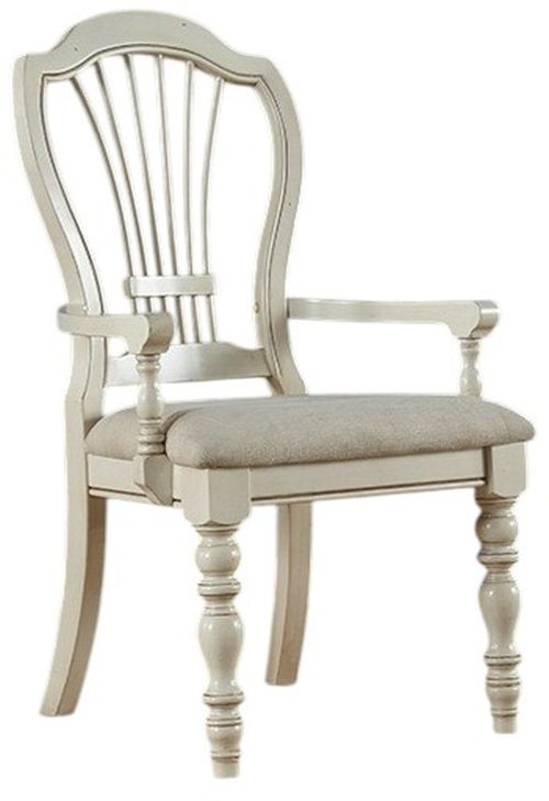 Pastoral elegance is the hallmark of Hillsdale’s Pine Island Dining Collection. The Pine Island Wheat Back Arm Chair, ideal for around the dining room table, is a beautifully constructed oversized chair featuring both doweled and corner blocked leg construction. The chair’s classic, laid back style is accented in hand rubbed finishes in either Old White or Dark Pine. It is constructed of solid wood using pine solids and lumber-core sides.