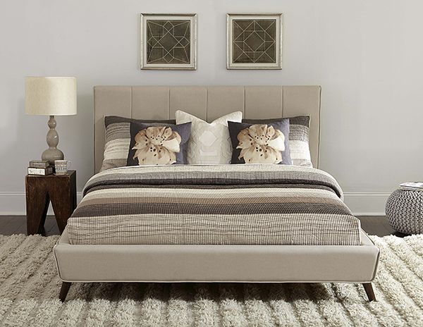 The Aussie bed would be the perfect bed to add a streamlined look to a bedroom. Upholstered in a neutral Fog fabric, it will work in any color scheme. The square silhouetted headboard is accented by the folded-in vertical seams running across it. An added touch of welting runs from the sides of the headboard, along the upholstered side rails, and along the low footboard as well. Chestnut brown feet add a natural look to the bed as well. No box spring required. Some assembly required.