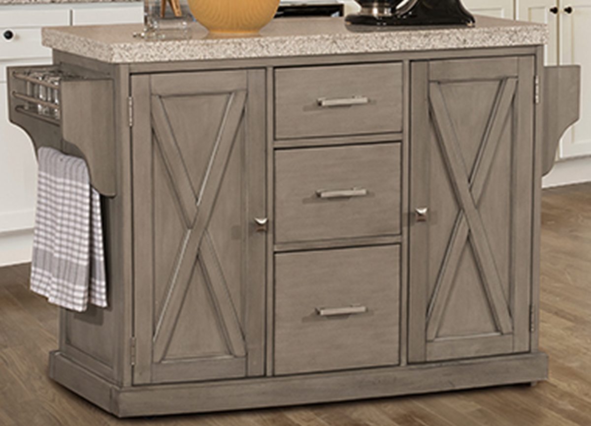 Casual style meets substantial functionality in the Hillsdale Furniture Brigham Kitchen Island. Featuring baseboard and flat panel molding with inlaid cross molding and minimalist hardware. This kitchen island table has all the charm of a country cottage. And it boasts two cabinets with adjustable shelves; three drawers with durable screw butt joints; as well as spice racks and towel rods at either end. The distressed gray finish and bespeckled gray tone granite top blend with any color palette. Organize your kitchen or dining room with the Brigham Kitchen Island. Assembly required.