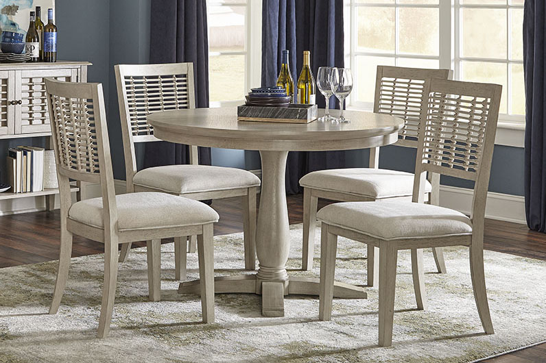 Breezy and graceful. The Hillsdale Furniture Ocala 5-Piece Dining Set includes one round pedestal table and four dining chairs all in a Sandy Gray wood finish. The chairs feature attractive rattan lattice backs and amply padded seats in an Ecru polyester upholstery with exquisite welt piping. Their contoured backs provide extra comfort. The table boasts a shapely and curvaceous cylindrical pedestal base with turned wood work at the plinth and four sturdy feet. Hardwood with veneer construction offers durability and stability. Perfect for any dining room or eat-in kitchen.