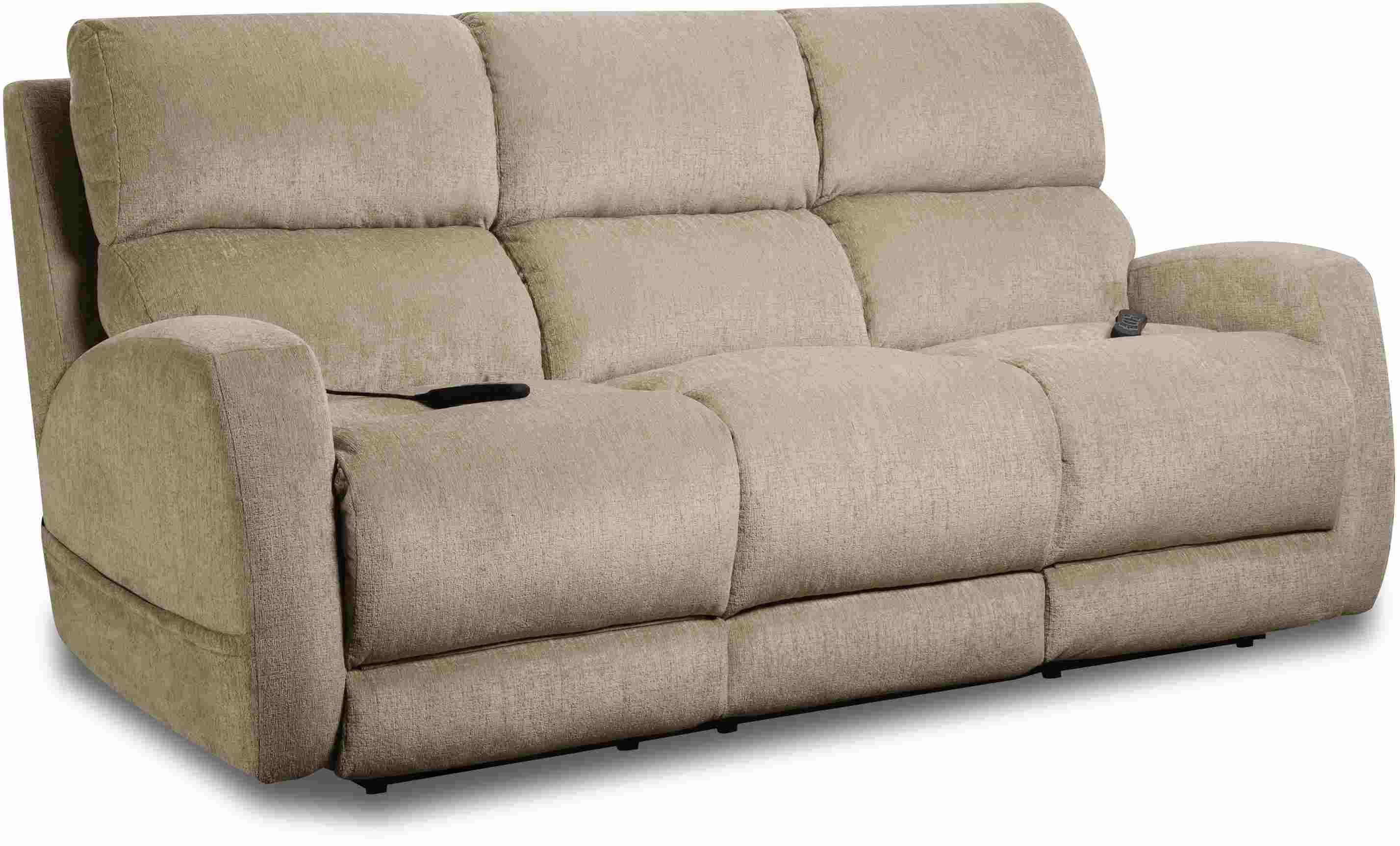 Part of the Custom Comfort collection, this double-reclining sofa features a power headrest, a power lumbar, and an extended footrest. Smaller scale and contemporary in style, the frame is covered in 100% polyester, which is easy to maintain. A side pocket proves neat and functional.