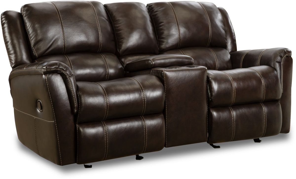 This loveseat is covered in a walnut colored leather fabric. Smooth to the touch, a center console for added storage, and a glide feature to the recline, you're sure to have the most comfortable seat in the house.Read More