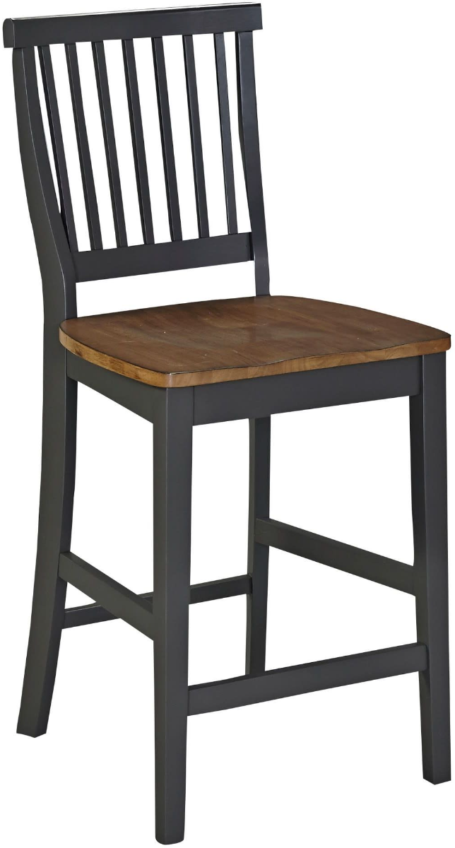 The Americana Bar Stool by homestyles is crafted from all solid hardwoods in a deep grey painted finish with a physically distressed oak-finished seat. Front, back and side stretchers for excellent support and stability. Shaped seat and contoured back for added comfort.