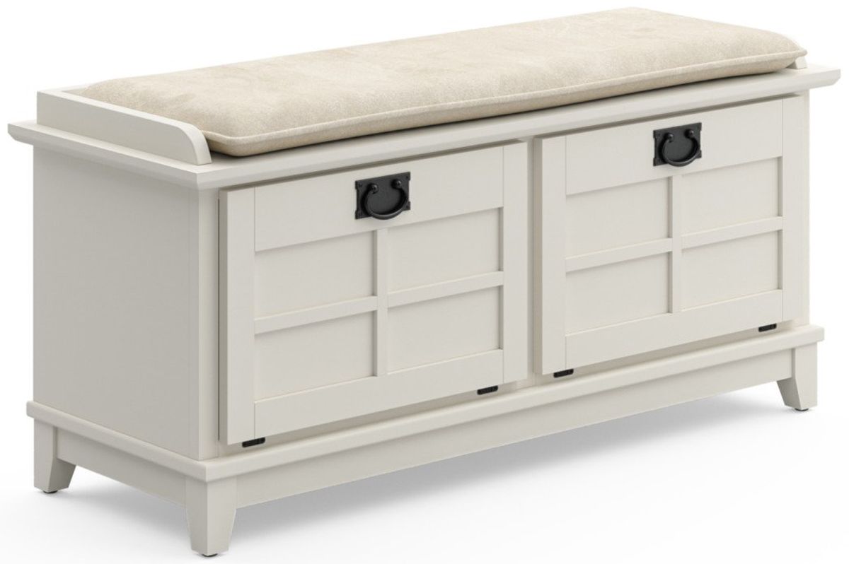 Mission styling at its best! The Arts and Crafts upholstered bench by homestyles embellishes typical mission styling with framed doors showcasing raised wood, lattice moldings, and slightly flared legs. Constructed of solid ash and veneers in a rich, white finish. Features include a comfortable padded natural ultra-suede removable and reversible cushion, dual drop down storage doors, and black matte hardware pulls. Size: 47.25"W x 18"D x 21"H. Assembly required. Finish and measurement may vary slightly.