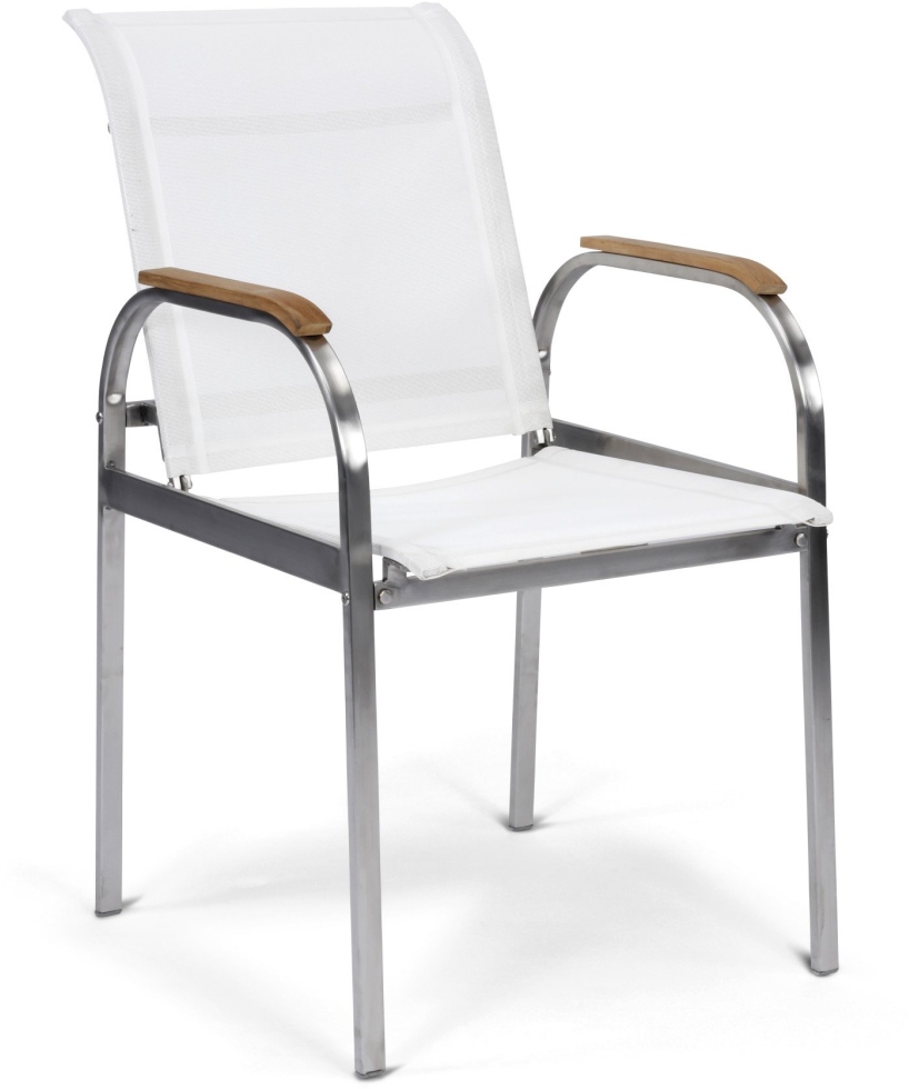 Lounge outdoors in comfort and style with the Aruba dining chair. This chair features a weather-resistant polished stainless steel frame, and the solid teak arm pads are finished with natural linseed oil to be water-resistant.Read More