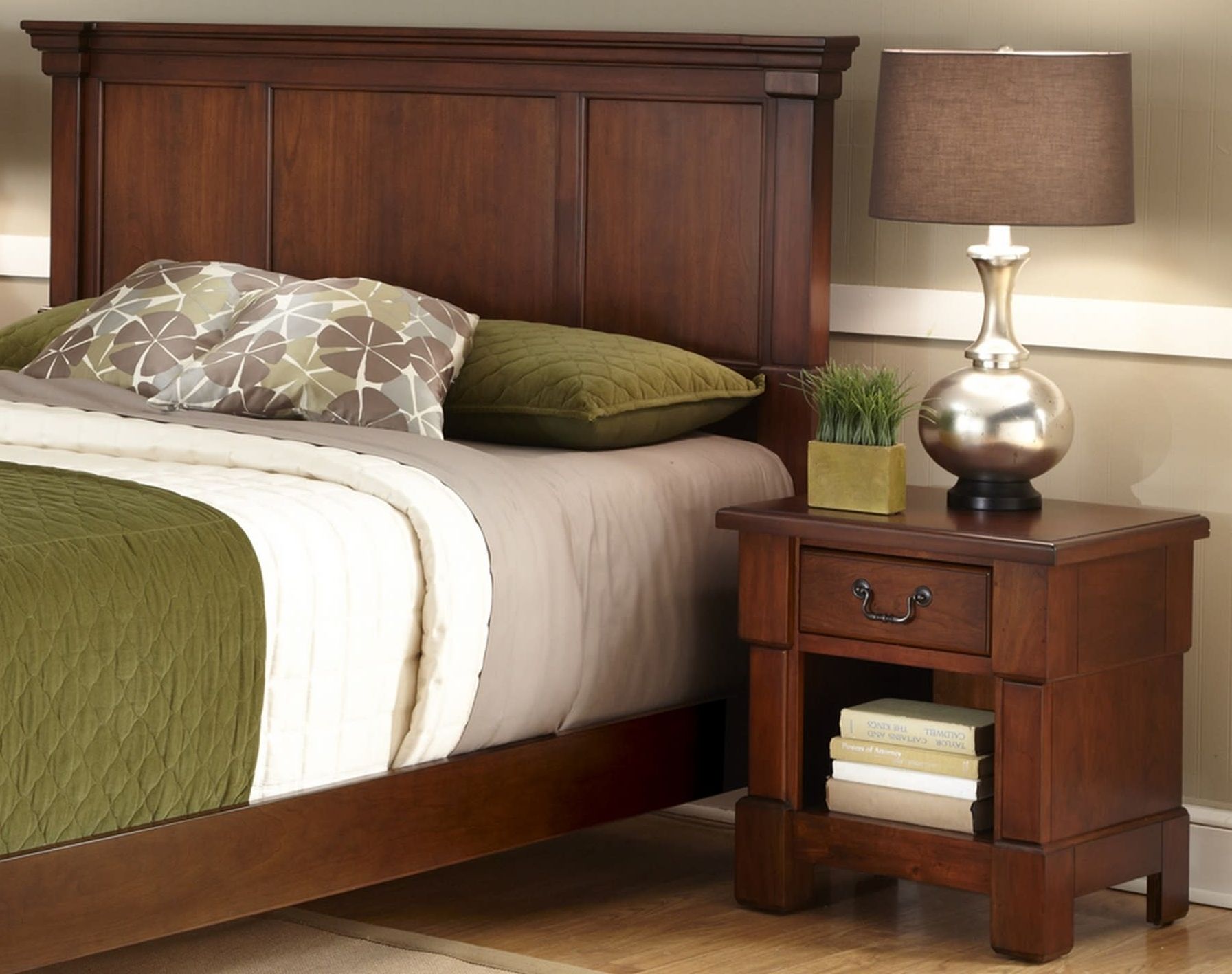 Create ambiance with a perfect balance of warmth and style with this Aspen King Headboard and Nightstand by homestyles. Solid mahogany and cherry veneers are warmed with a rustic cherry finish. The headboard encapsulates distinguished Americana style with bold recessed picture frame moldings and rich carved detailed posts. The nightstand has bold recessed picture frame moldings, rich carved detailed posts, and antiqued brass hardware. There is one drawer with side-mounted easy-glide suspension and one large open storage area below.