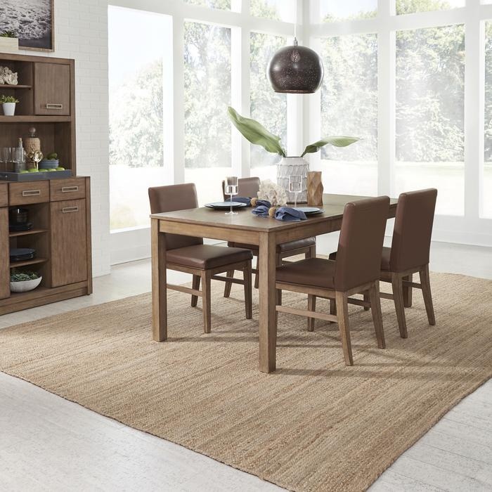 The 5-Piece Dining Set by homestyles has a California contemporary design with a slightly weathered driftwood, natural brown oak finish. The table is crafted from ash hardwood solids and straight grain oak veneers over engineered wood. An aproned leaf extends the table to 66"D and allows it to remain in the extended position with a finished look. Four chairs feature upholstered, tan faux bi-cast leather seats and backs. Wood stretchers on the sides and back legs add support. Finish and measurements may vary slightly. Assembly required. Arrives at your door by parcel delivery service. Table: 30"H x 48"W x 36"D (66"W with leaf extended). Chairs: 35.25"H x 18"W x 22.75"D. Seat height: 18.75"H.