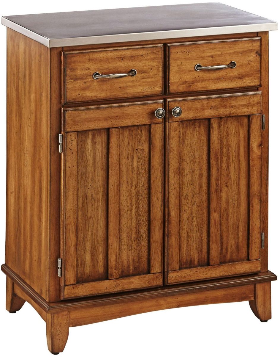 Small Server with Stainless Steel Top by homestyles is constructed of hardwood and wood products in a cottage oak finish with an 18-gauge stainless steel top. Features include two utility drawers, two wood-framed cabinet doors with an adjustable shelf inside for plenty of storage, and brushed steel hardware.
