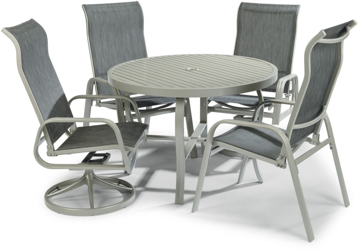 Enjoy the good life with this Captiva 5-piece dining group, which turns your outdoor spaces into inviting retreats. The set includes a 42"D dining table, two swivel chairs, and two arm chairs, all in a lightweight aluminum frame that will make your outdoor living maintenance-free. The table features cross leg supports for added stability, and a center hole for an umbrella with a cap to plug it when not in use. The swivel chairs and the arm chairs feature contoured sling seats with high backs that you can relax in for hours. Table size: 42-1/2"W x 42-1/2"D x 28-3/4"H. Arm chair size: 23-1/4"W x 29-3/4"D x 43-1/4"H. Swivel chair size: 23-1/4“W x 28-1/2"D x 43-1/4"H.