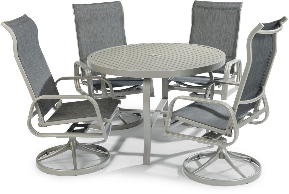 Enjoy the good life with this Captiva 5-piece dining group, which turns your outdoor spaces into inviting retreats. The set includes a 42"D dining table and four swivel chairs, all in a lightweight aluminum frame that will make your outdoor living maintenance-free. The table features cross leg supports for added stability, and a center hole for an umbrella with a cap to plug it when not in use. The swivel chairs rotate 360-degrees and feature contoured sling seats with high backs that you can relax in for hours. Table size: 42-1/2"W x 42-1/2"D x 28-3/4"H. Chair size: 23-1/4“W x 28-1/2"D x 43-1/4"H. Seat height: 18-1/2"H.