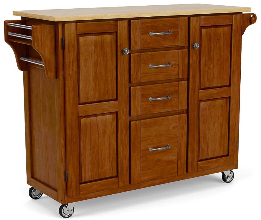 Create a stylish statement with the Create-a-Cart Kitchen Cart by homestyles. This versatile kitchen cart features a handsome cherry finish with a natural top, which is ideal for preparing and serving meals. Great for a craft room too. Constructed of premium-level, solid wood. This cart offers plenty of storage with four large, easy glide drawers and two cabinet doors with customizable shelves inside and stylish recessed panels. The cart has a towel bar on each side and a spice rack. Locking rubber casters allow portability, with two locking for stability. Comes carefully packaged with all items labeled and coordinating easy-to-follow assembly directions.