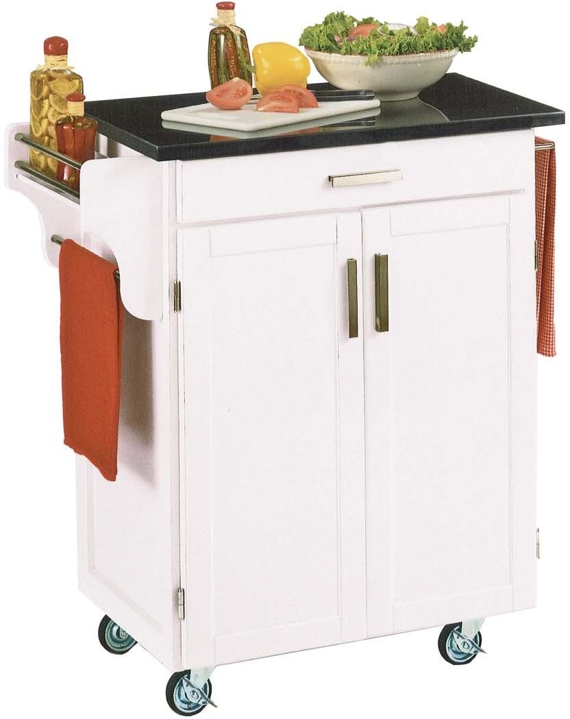 The homestyles Cuisine Kitchen Cart adds function and storage to kitchen and dining areas. The versatile cart features solid wood construction with a white finish and black granite top. There is a roomy utility drawer and lower double-door cabinet with adjustable shelf. The cart is also outfitted with a handy spice rack and towel bars on each side. Brushed nickel hardware. Heavy duty rubber casters offer easy mobility and two lock for safety. Comes carefully packaged with all items labeled and coordinating easy-to-follow assembly directions.