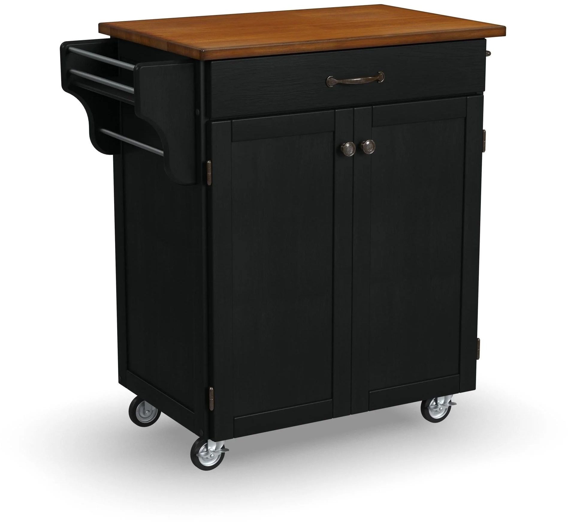 The homestyles Cuisine Kitchen Cart adds function and storage to kitchen and dining areas. The versatile cart features solid wood construction with a black finish and.75" oak top with medium finish. There is a roomy utility drawer and lower double-door cabinet with adjustable shelf.Read More