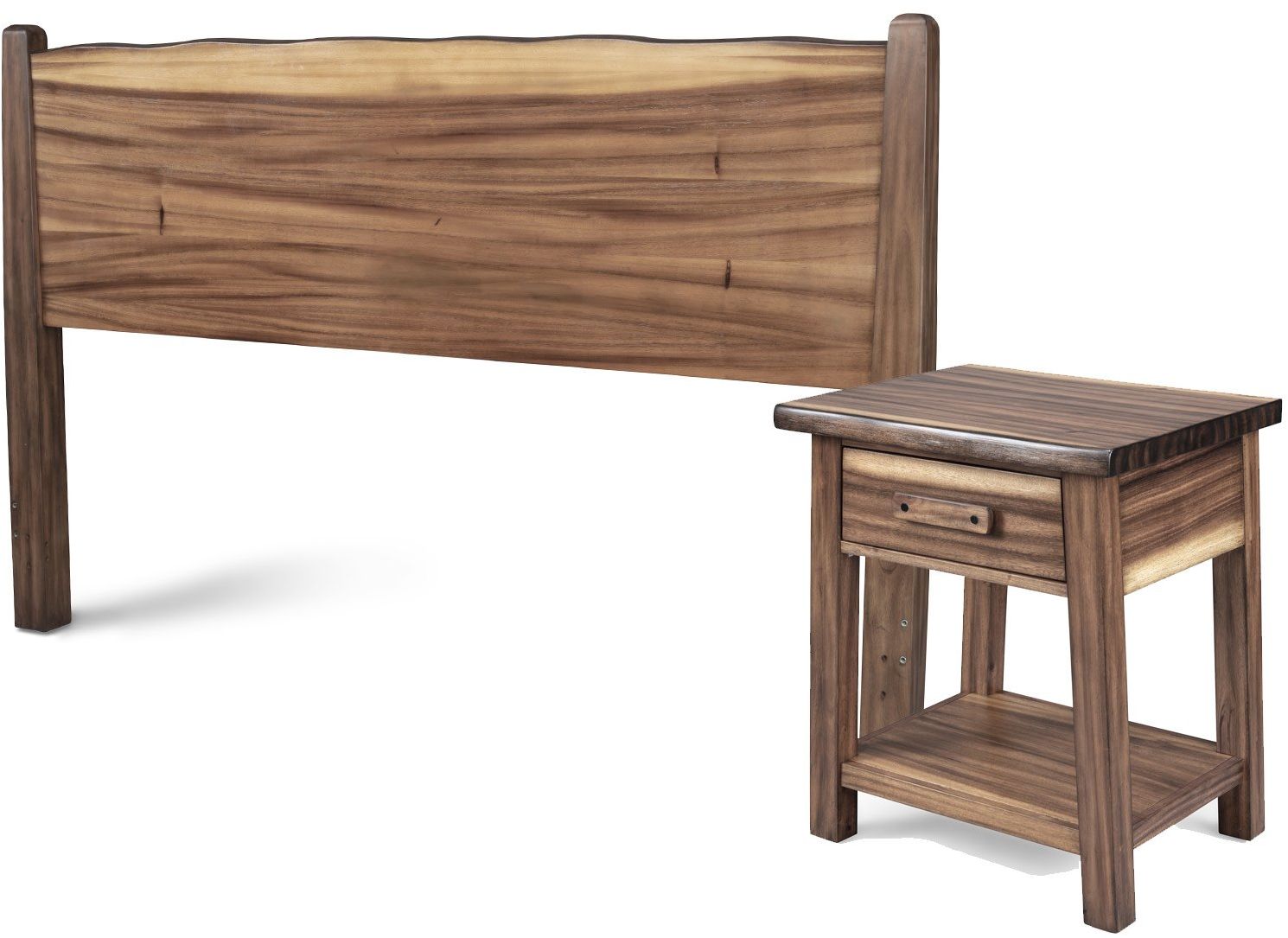 Inspired by the tropical rain forest, the Forest Retreat King Headboard and Nightstand capture the alluring look of a live edge design for a natural-looking rugged elegance. Crafted from tropical grained wood veneers over engineered woods, each piece is finished with a natural teak look that provides the dramatic light to dark grain pattern. Simple yet striking, this combination complements a wide array of styles ranging from modern rustic to relaxed retreat. Part of a whole home solution, this bedroom set transforms your space into an inviting haven.