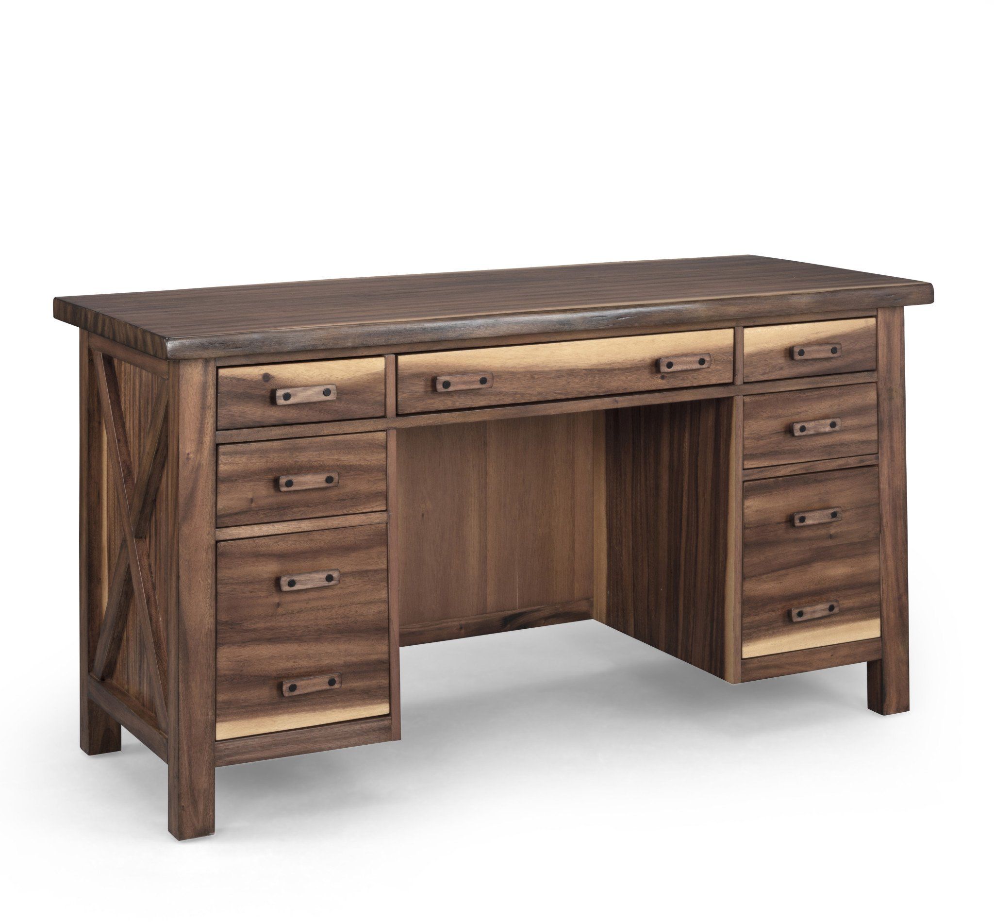 Inspired by the tropical rain forest, the Forest Retreat Pedestal Desk captures the alluring look of a live edge design for a natural-looking rugged elegance. Crafted from tropical grained wood veneers over engineered woods, this desk is finished with a natural teak look that provides the dramatic light to dark grain pattern. Simple yet striking, the desk features ample storage with two lower file drawers, four additional storage drawers, and a drop-down lap drawer for keyboard use. Part of a whole home solution, the Forest Retreat Pedestal Desk will transform your home office into an inviting haven.
