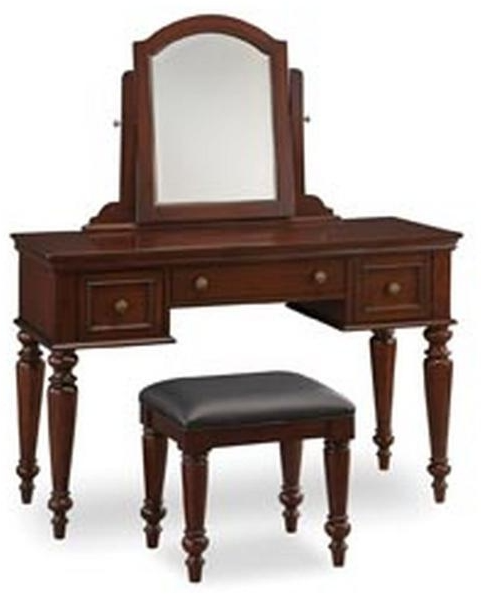 An elegant design heightens the allure of the Lafayette Vanity Set by homestyles. Crafted of mahogany solids and cherry veneers for years of use. The cultured vanity table is designed with a lovely profile-edged top, curved accents, spindle legs, and antiqued brass hardware. The set includes a vanity table, mirror and bench. The table features a center drawer and two outer drawers with felt linings. The tilt mirror has a beveled glass and can be removed if a desktop is desired. The bench features a cushioned black vinyl seat and spindle legs. Comes carefully packaged with all items labeled and coordinating easy-to-follow assembly directions. Delivered to your door.