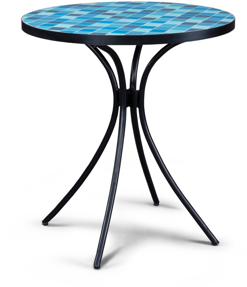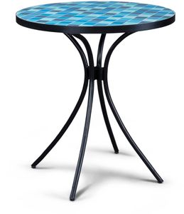 Add a little vitamin D to your next brunch or morning coffee by bringing the festivities outdoors. This Larimar bistro table features an ocean-inspired mosaic of blue, white and grey tiles, each applied by hand to make every top truly unique. A metal edge protects the tile surface, while a powder-coated metal frame creates a sturdy foundation. The center umbrella hole includes a cap to cover it when not in use.