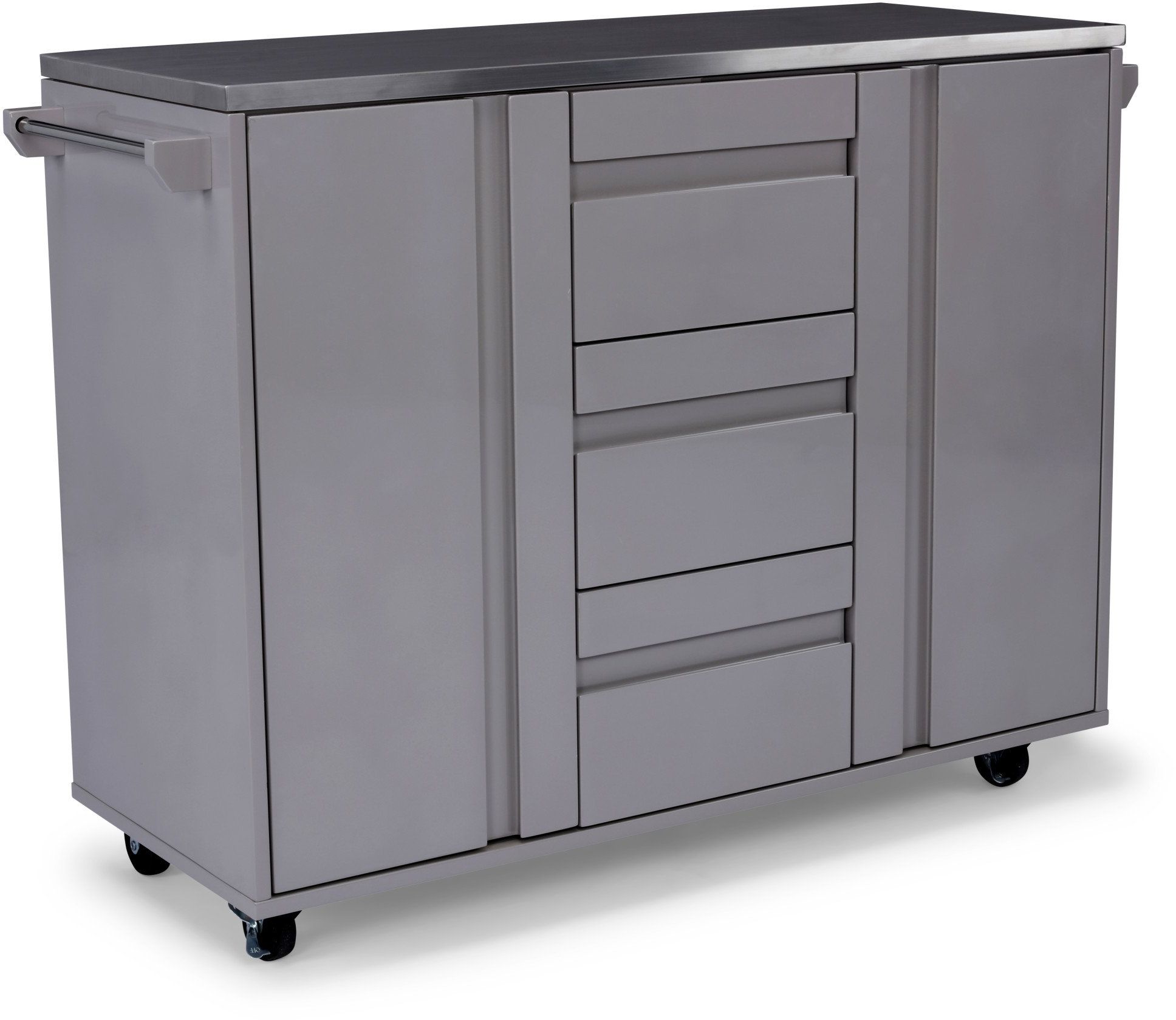 Contemporary European design, featuring durable high gloss polyurethane warm grey painted finished body. Crafted from poplar solids and engineered woods; finished on all 4 sides. Two outer doors, with soft close European hinges, open to large storage areas with 2 adjustable shelves in each. Three center drawers feature full depth storage. Four metal frame casters allow for easy mobility with 2 of them locking.