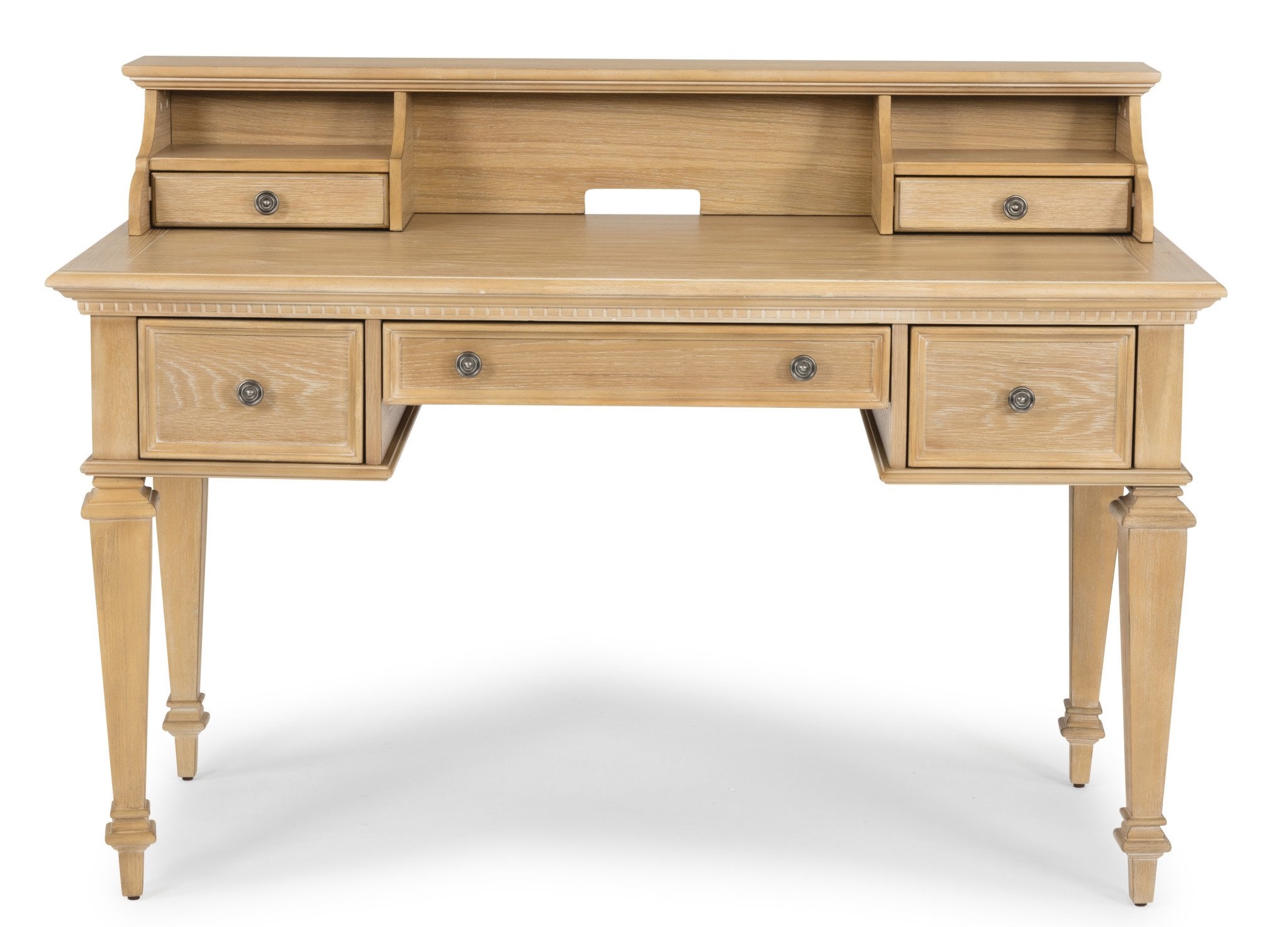 Traditional design with a hint of contemporary. The Manor House Desk with Hutch by homestyles is crafted from wire-brushed hardwood solids and white oak veneers over engineered woods with an aged waxed, white oak finish. The desk features carved, turned legs. There's a piano molding under the top, adding to the traditional designRead More