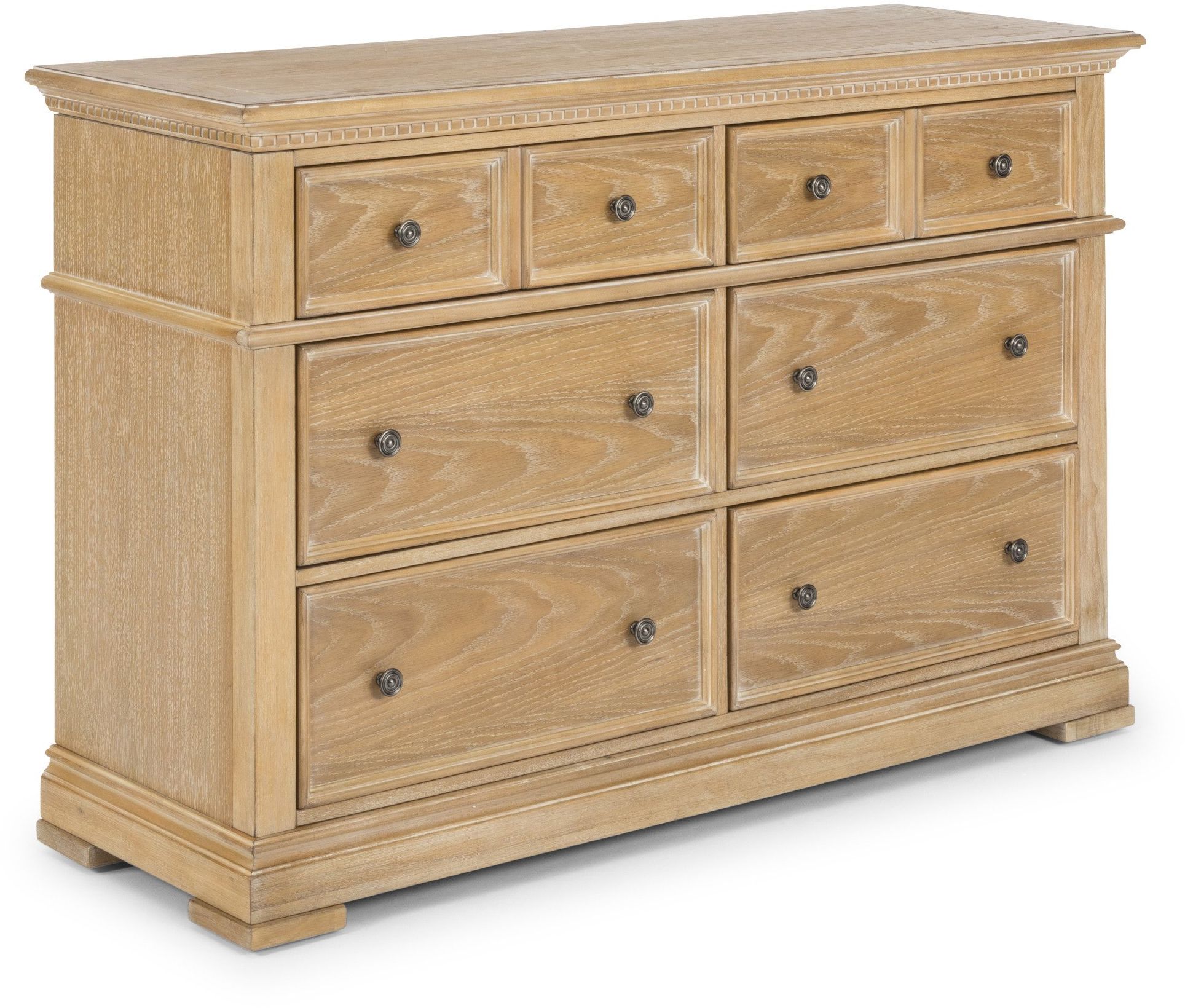 Traditional design with a hint of contemporary. The Manor House Dresser by homestyles is crafted from wire-brushed hardwood solids and white oak veneers over engineered woods with an aged waxed, white oak finish. Features a raised base with block feet and a piano molding under the top, adding to the traditional design. Six deep, equal-sized drawers have outer-edge, picture frame molding and antique nickel drawer pulls. The top two drawers have a faux two-drawer look and felt-lined bottom for more delicate items.
