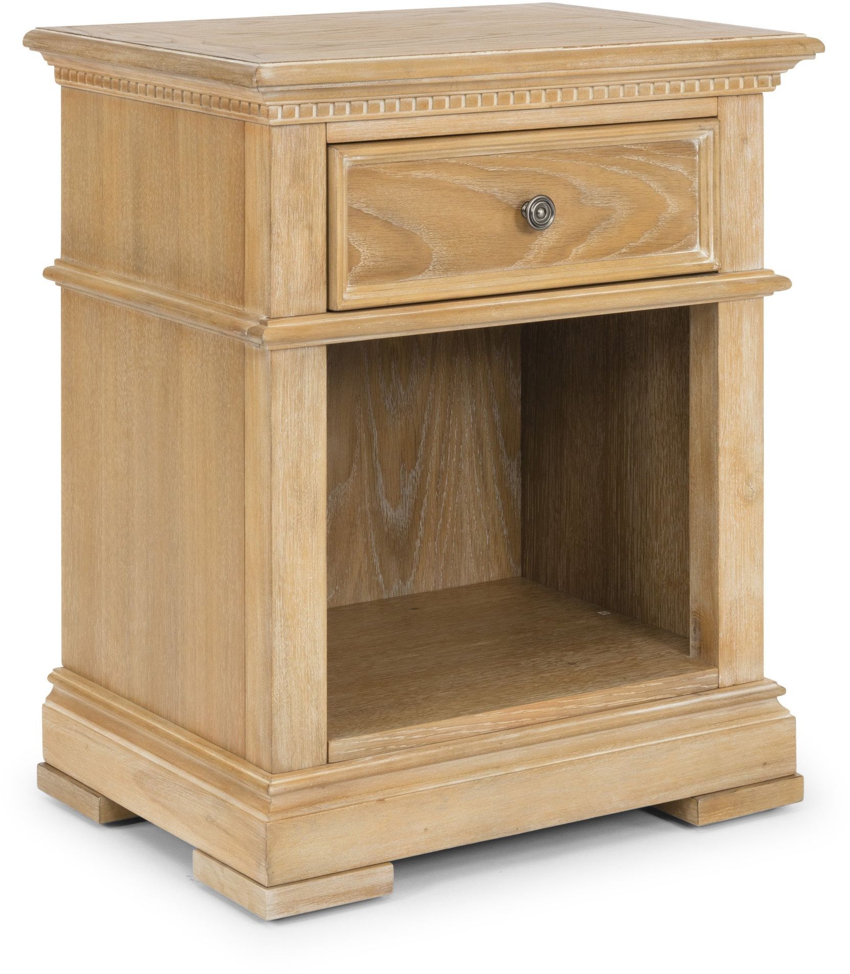 Traditional design with a hint of contemporary. The Manor House Nightstand by homestyles is crafted from wire-brushed hardwood solids and white oak veneers over engineered woods with an aged waxed, white oak finish. Features a raised base with block feet and a piano molding under the top, adding to the traditional design. One drawer features an outer edge, picture frame molding and antique nickel drawer pull. There is a lower open storage space.