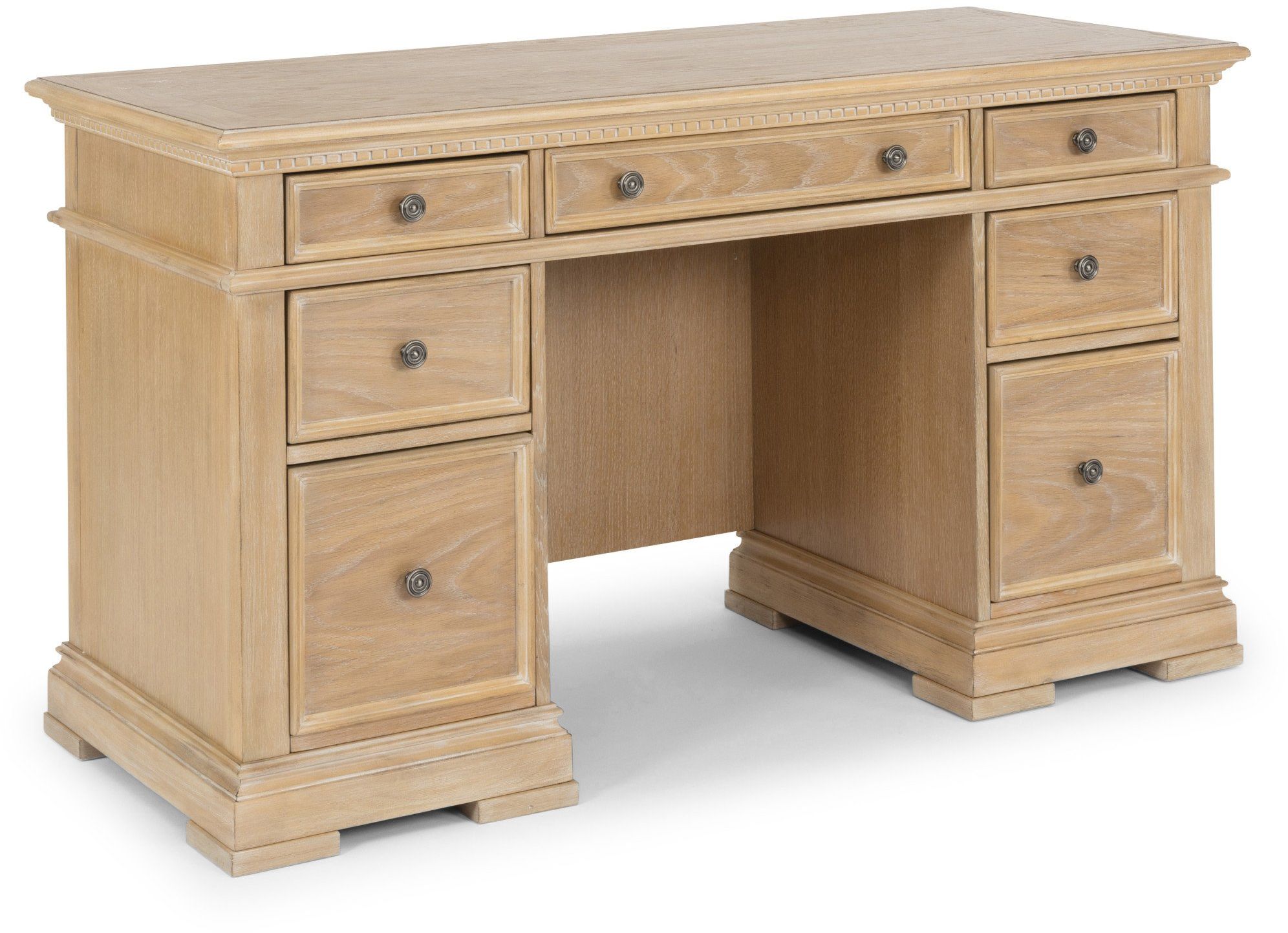 Traditional design with a hint of contemporary. The Manor House Pedestal Desk by homestyles is crafted from wire-brushed hardwood solids and white oak veneers over engineered woods with an aged waxed, white oak finish. The desk features a raised base with eight block feet and is finished on all for sides. There is a center modesty panel and two file drawers on each lower side with full extension glides, allowing for letter- or legal-sized files. The desk features four utility drawers with a single fold-down lap drawer front for easy keyboard access. Drawer backs have a cut-out for electrical cord access