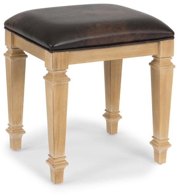 Traditional design with a hint of contemporary. The Manor House Vanity Bench by homestyles is crafted from wire-brushed hardwood solids with an aged waxed, white oak finish. The bench features a padded upholstered top covered in brown leather.Read More