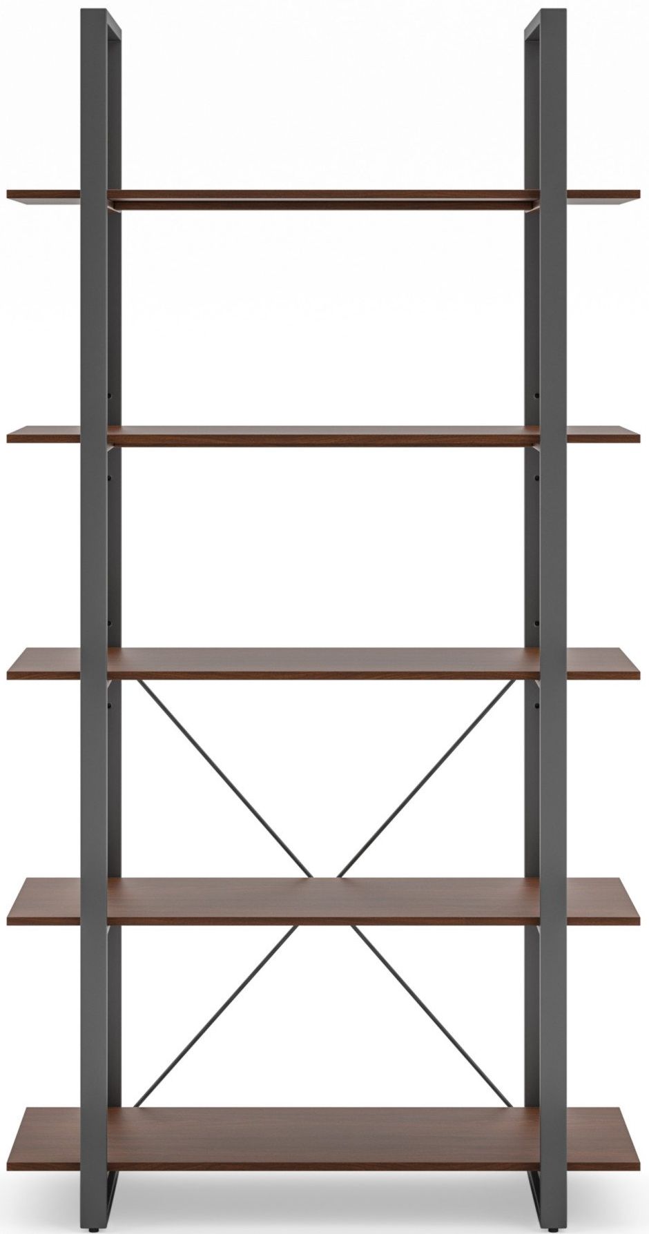 Organize books or showcase valuables with this Homestyles Merge Five-Shelf Bookcase. Whether used in an office setting, living room or bedroom, this vertical storage solution is ideal for smaller spaces. The light scale frame gives it a minimalist appeal, which accentuates the warm walnut veneer. The lacquer top coat protects the finish and creates totally worry-free ownership.Read More