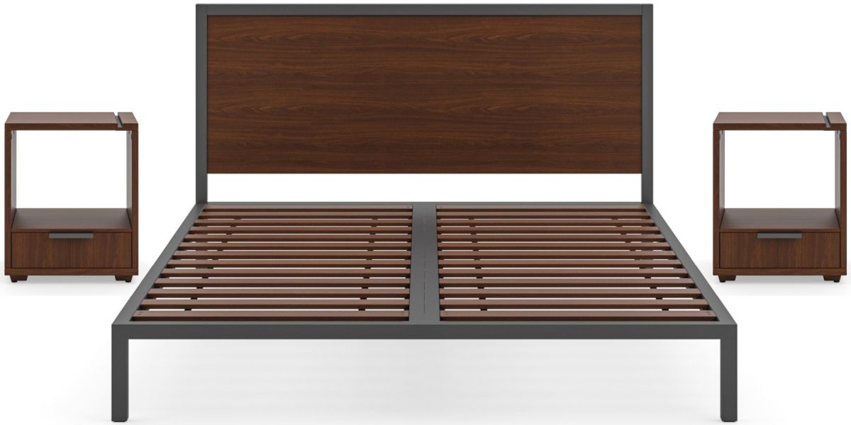 The bed is the natural centerpiece of any bedroom, and you can make it even more of a focal point with this Homestyles Merge Queen Platform Bed with Headboard and 2 Nightstands. This 3-piece set includes the bed and matching nightstands to give you all the basics for a bedroom. The solid mahogany combines with walnut veneer and engineered wood to create a bed that's equally attractive and durable. The European style slats support any standard queen size mattress. The lacquer top coat protects the finish and creates totally worry-free ownership.Read More