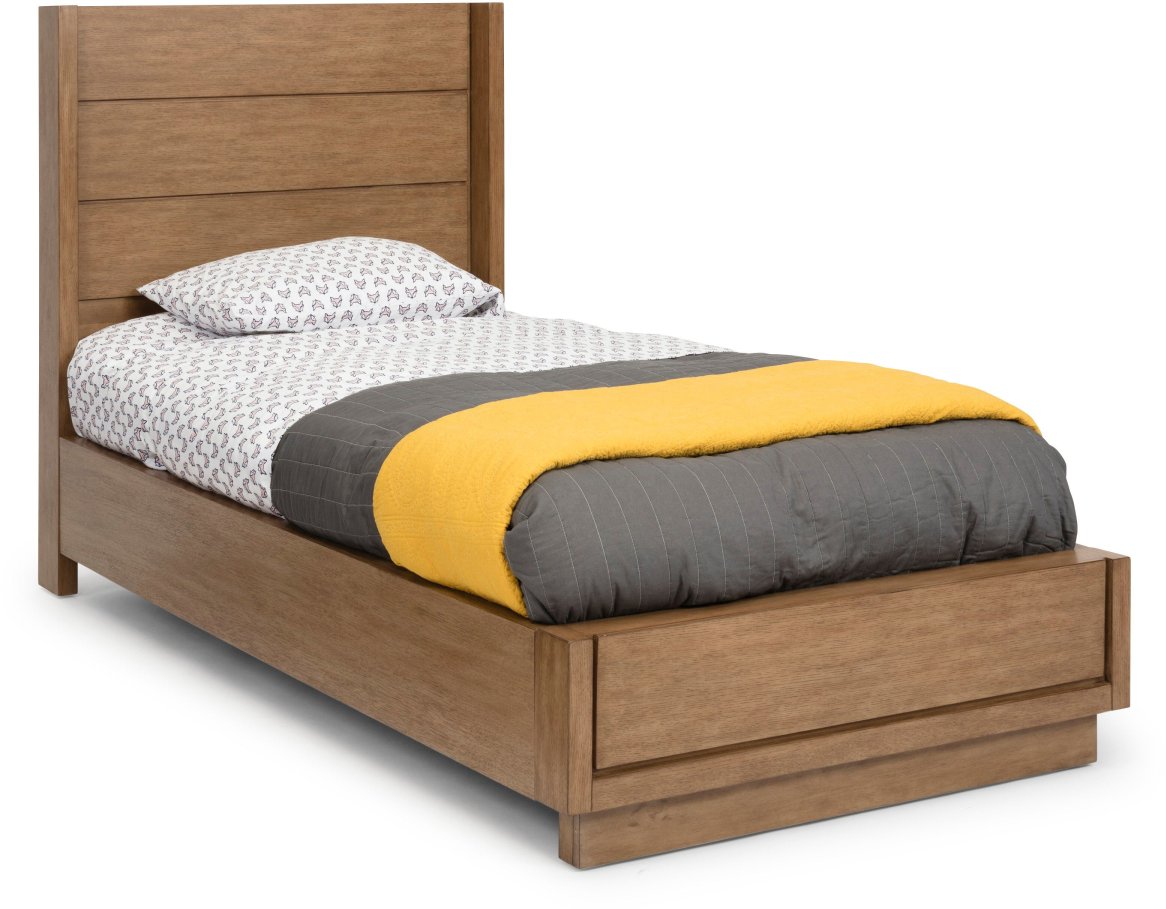 California contemporary design with slightly weathered look to a natural brown oak finish. Crafted from hardwood solids and straight grain oak veneers over engineered wood, with the solid wood surfaces having a wire brush texture to provide that weathered look. Modified shelter design to the headboard with a plank look effect. The bed is designed to accommodate a twin mattress with multiple slats for support, giving a platform look, or can be converted to accommodate a twin mattress and box spring. 9 ½” side rails provide the look and support of a platform bed. Low profile footboard with plinth style base. Note finish and measurements may vary slightly. Assembly required. W-42”, D-82 ½”, H-48”