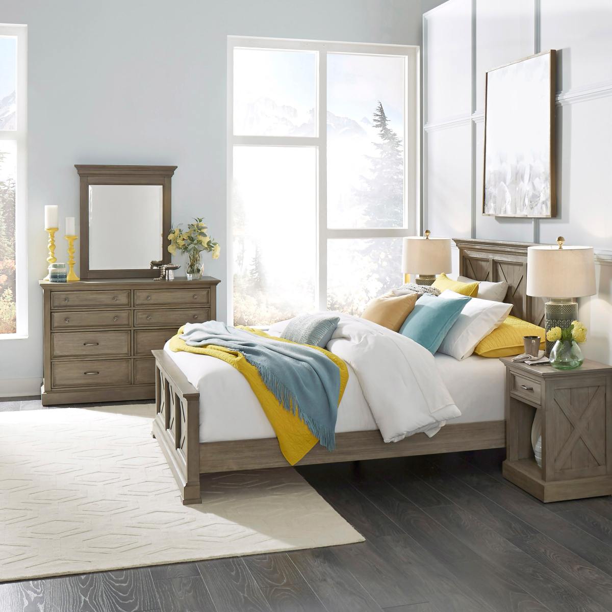 Rustic casual design that is at home in a mountain lodge, as it is in a mid-town loft. Crafted of mahogany solids and veneers with engineered woods, that features solid wood “X” frame design, with inset wainscot panels, with all surfaces wired brushed to provide a rough-hewn look. Finished in a multi-colored gray that provides unique high lighting to the design. Headboard and Footboard both feature large shaped solid wood molded tops. Footboard has solid wood molded base with block feet. Includes 6- inch side rails and slats with center adjustable legs. Night Stand features a single drawer, with a large open storage area below. The Dresser features 2 top drawers with felt lined bottoms, to protect delicate items. All drawers are framed and feature antiqued nickel finished drawer pulls. The Mirror features beveled glass, wood mounting bars to attach to the dresser, or has brackets for hanging on the wall. Arrives to your door by parcel delivery service. Note finish and measurements may vary, assembly required. Bed: W-66 ¾”, D-89 ½”, H-50”; Night Stand: W-22”, D-16 ¾”, H-26”; Dresser: W-54”, D-18 ¾”, H-36”; Mirror: W-32”, D-3”, H-36”.